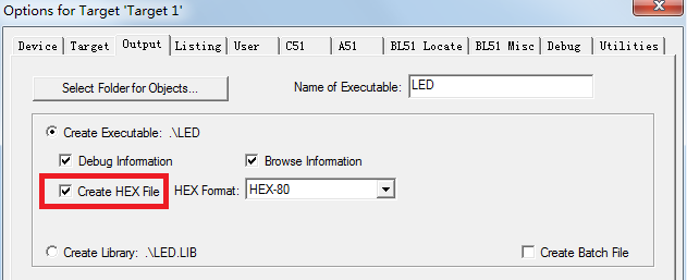 在弹出的对话框中,点击 Output 选项页,勾选其中的“Create HEX File”复选框,然后点 OK,如图2-18所示。