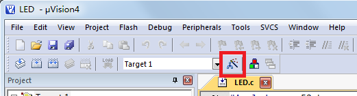 程序编好了,我们要对我们的程序进行编译,生成我们需要的可以下载到单片机里的文件,在编译之前,我们先要勾选一个选项,Project-->Options for Target „Target1‟...,或者直接点图 2-17中红框内的快捷图标: