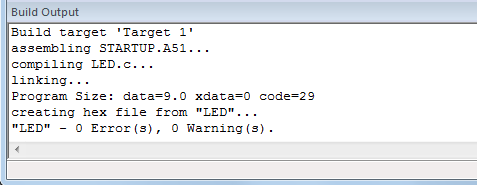 编译完成后,在我们的 Keil 下方的 Output 窗口会出现相应的提示,大家注意看图2-20,这个窗口告诉我们编译完成后的情况,data=9.0,指的是我们的程序使用了单片机内部的256字节 RAM 资源中的9个字节,code=29 的意思是使用了 8 K 代码 Flash 资源中的29个字节。