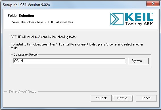 3) 点击“Next”按钮,弹出“Folder Selection”对话框,如图1-3所示。这里可以设置安装路径,默认安装路径在“C:Keil”文件夹下。点击“Browse...”按钮,可以修改安装路径,这里建议大家用默认的安装路径,如果你要修改,也必须使用英文路径,不要使用包含有中文字符的路径。