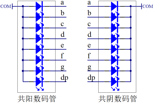 数码管分为共阳和共阴两种,共阴数码管就是8只 LED 小灯的阴极是连接在一起的,阴极是公共端,由阳极来控制单个小灯的亮灭。同理,共阳数码管就是阳极接在一起,大家可以认真研究下图5-4。细心的同学会发现,图5-3的数码管上边有2个 com,这就是我们数码管的公共端。为什么有2个呢,一方面是2个可以起到对称的效果,刚好是10个引脚,另外一个方面,公共端通过的电流较大,我们初中就学过,并联电路电流之和等于总电流,用2个 com 可以把公共电流平均到2个引脚上去,降低单条线路承受的电流。