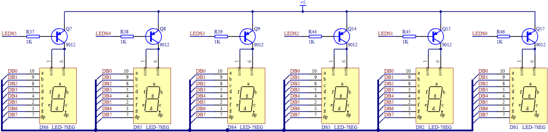 从我们开发板的电路图上能看出来,我们所用的数码管都是共阳数码管,一共有6个,如图5-5所示。