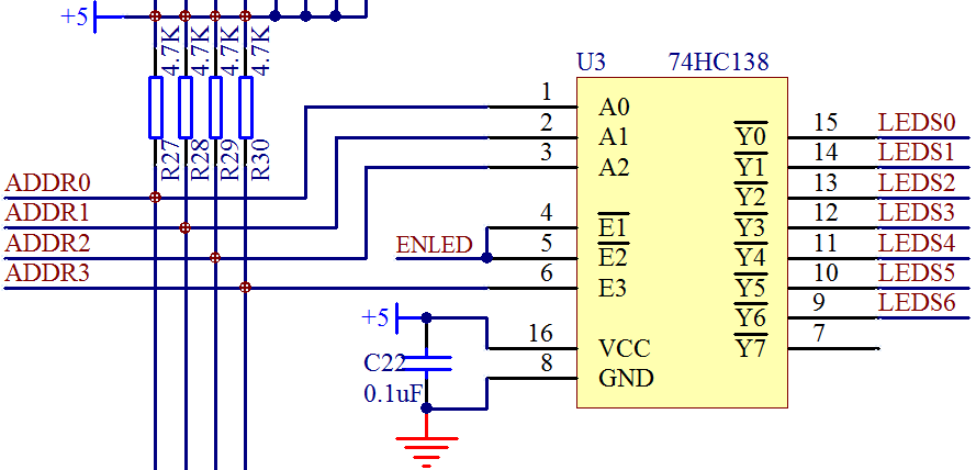 我们现在的目的是让 LEDS0 这个引脚输出低电平,相信大家现在可以根据前边学过的知识独立把 ADDR0、ADDR1、ADDR2、ADDR3、ENLED 这4个所需输入的值写出来了,现在大家不要偷懒,根据 74HC138 的手册去写一下,不需要你记住这些结论,但是遇到就写一次,锻炼过几次后,遇到同类芯片自己就知道如何去解决问题了。