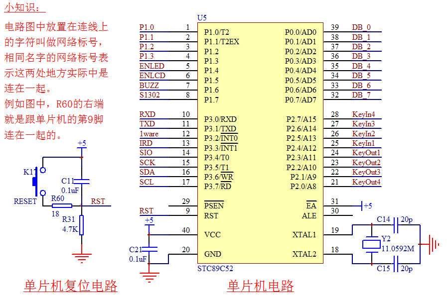 这张最小系统的电路图节选自我们的 KST-51 开发板原理图,下面我们就照这张电路图来具体分析最小系统的三要素。