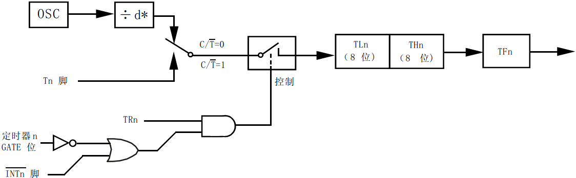 我带领大家一起来分析一遍这个示意图,日后如果再遇到类似的图,大家就可以自己研究了。OSC 框表示时钟频率,因为1个机器周期等于12个时钟周期,所以那个 d 就等于12。下边 GATE 右边的那个门是一个非门电路,再右侧是一个或门,再往右是一个与门电路,大家可以对照一下5-1节的内容。