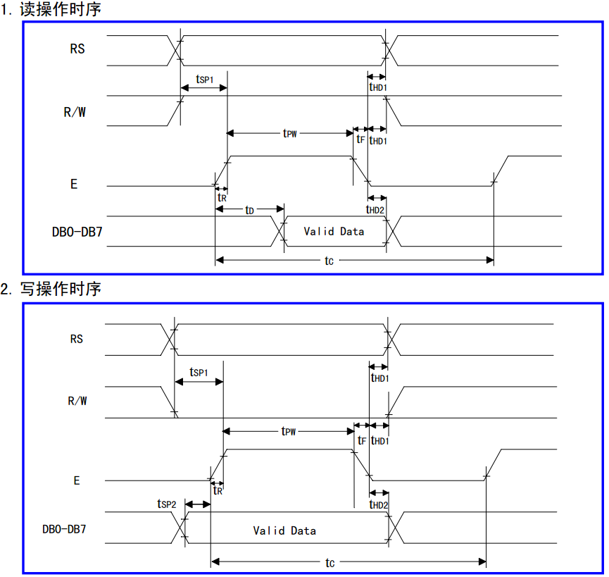 tSP1:指的是 RS 和 R/W 引脚使能后至少保持 30 ns,使能引脚 E 才可以变成高电平,这个条件同样也完全满足。
