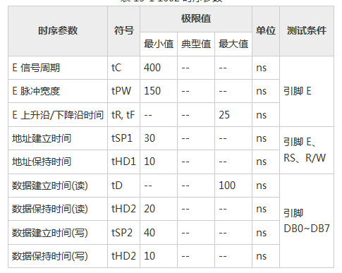 1602 的时序问题,大家要学会通过 LCD1602 的数据手册提供的时序图和时序参数表格来进行研究,而且看懂时序图是学习单片机所必须掌握的一项技能,如图13-2所示。