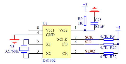 涓流充电功能,基本也用不到,因为实际应用中很少会选择可充电电池作为备用电源,成本太高,本课程也不讲了,大家作为选学即可。我们使用的时候直接用 5 V 电源接一个二极管,在主电源上电的情况下给电容充电,在主电源掉电的情况下,二极管可以防止电容向主电路放电,而仅用来维持 DS1302 的供电,这种电路的最大用处是在电池供电系统中更换主电池的时候保持实时时钟的运行不中断,1分钟的时间对于更换电池足够了。此外,通过我们的使用经验,在 DS1302 的主电源引脚串联一个 1 K 电阻可以有效的防止电源对 DS1302 的冲击,R6 就是这个电阻,而 R9、R26、R32 都是上拉电阻。