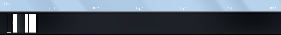 结合图16-7我们就能看明白了,最前面黑乎乎的一段,是引导码的 9 ms 载波,紧接着是引导码的 4.5 ms 的空闲,而后边的数据码,是众多载波和空闲交叉,它们的长短就由其要传递的具体数据来决定。HS0038B 这个红外一体化接收头,当收到有载波的信号的时候,会输出一个低电平,空闲的时候会输出高电平,我们用逻辑分析仪抓出来一个红外按键通过HS0038B 解码后的图形来了解一下,如图16-8所示。