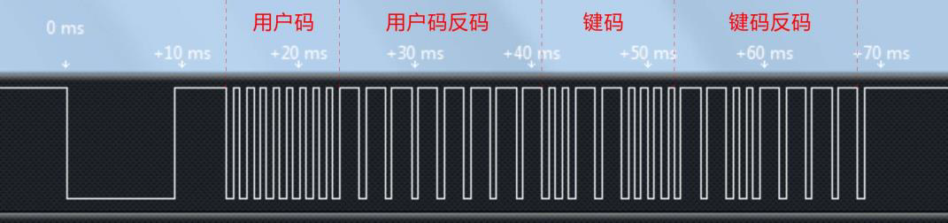 从图上可以看出,先是 9 ms 载波加 4.5 ms 空闲的起始码,数据码是低位在前,高位在后,数据码第一个字节是8组 560 us 的载波加 560 us 的空闲,也就是 0x00,第二个字节是8组 560 us的载波加 1.68 ms 的空闲,可以看出来是 0xFF,这两个字节就是用户码和用户码的反码。按键的键码二进制是 0x0C,反码就是 0xF3,最后跟了一个 560 us 载波停止位。对于我们的遥控器来说,不同的按键,就是键码和键码反码的区分,用户码是一样的。这样我们就可以通过单片机的程序,把当前的按键的键码给解析出来。