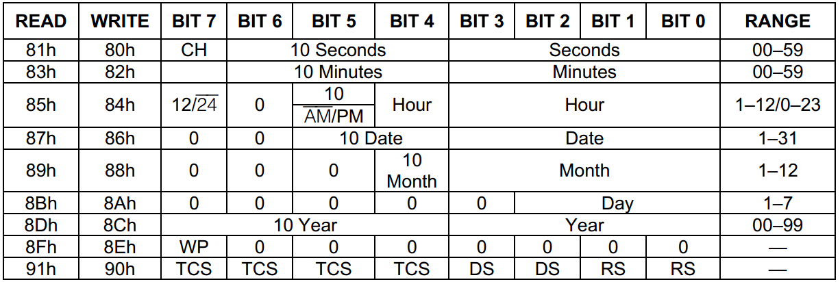 DS1302 时钟的寄存器,其中8个和时钟有关的,5位地址分别是 0b00000~0b00111,还有一个寄存器的地址是 01000,这是涓流充电所用的寄存器,我们这里不讲。在 DS1302 的数据手册里的地址,直接把第7位、第6位和第0位值给出来了,所以指令就成了 0x80、0x81 那些了,最低位是1,那么表示读,最低位是0表示写,如图15-10所示。