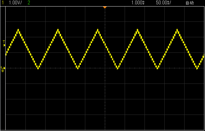 这几张图可以直观的看到我们程序输出的波形。细心的同学会发现我们波形上有很多小锯齿,没有平滑的连起来。这是因为我们 DA 最多只能输出 0~Vref 之间的256个离散的电压值,而不是连续的任意值,所以每个离散值都会持续一定的时间,然后跳变到下一个离散值,于是就呈现出了波形上的这种锯齿。在实际开发中,我们只需要在 DA 后级加一级低通滤波电路,就可以让带锯齿的波形变得平滑起来。