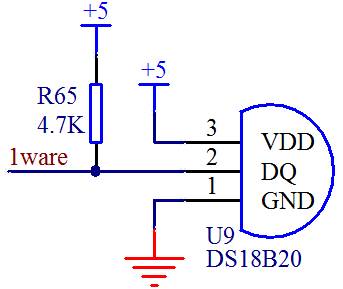 DS18B20 是美信公司的一款温度传感器,单片机可以通过 1-Wire 协议与 DS18B20 进行通信,最终将温度读出。1-Wire 总线的硬件接口很简单,只需要把 DS18B20 的数据引脚和单片机的一个 IO 口接上就可以了。硬件的简单,随之而来的,就是软件时序的复杂。1-Wire总线的时序比较复杂,很多同学在这里独立看时序图都看不明白,所以这里还要带着大家来研究 DS18B20 的时序图。我们先来看一下 DS18B20 的硬件原理图,如图16-12所示。