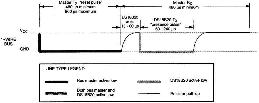 存在脉冲检测过程,首先单片机要拉低这个引脚,持续大概 480 us 到 960 us 之间的时间即可,我们的程序中持续了 500 us。然后,单片机释放总线,就是给高电平,DS18B20 等待大概15到 60 us 后,会主动拉低这个引脚大概是60到 240 us,而后 DS18B20 会主动释放总线,这样 IO 口会被上拉电阻自动拉高。