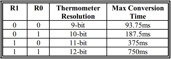 当我们发送一个启动温度转换的指令后,DS18B20 开始进行转换。从转换开始到获取温度,DS18B20 是需要时间的,而这个时间长短取决于 DS18B20 的精度。前边说 DS18B20 最高可以用12位来存储温度,但是也可以用11位,10位和9位一共四种格式。位数越高,精度越高,9位模式最低位变化1个数字温度变化0.5度,同时转换速度也要快一些,如图16-16所示。