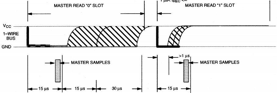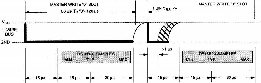 当要给 DS18B20 写入0的时候,单片机直接将引脚拉低,持续时间大于 60 us 小于 120 us就可以了。图上显示的意思是,单片机先拉低 15 us 之后,DS18B20 会在从 15 us 到 60 us 之间的时间来读取这一位,DS18B20 最早会在 15 us 的时刻读取,典型值是在 30 us 的时刻读取,最多不会超过 60us,DS18B20 必然读取完毕,所以持续时间超过 60 us 即可。