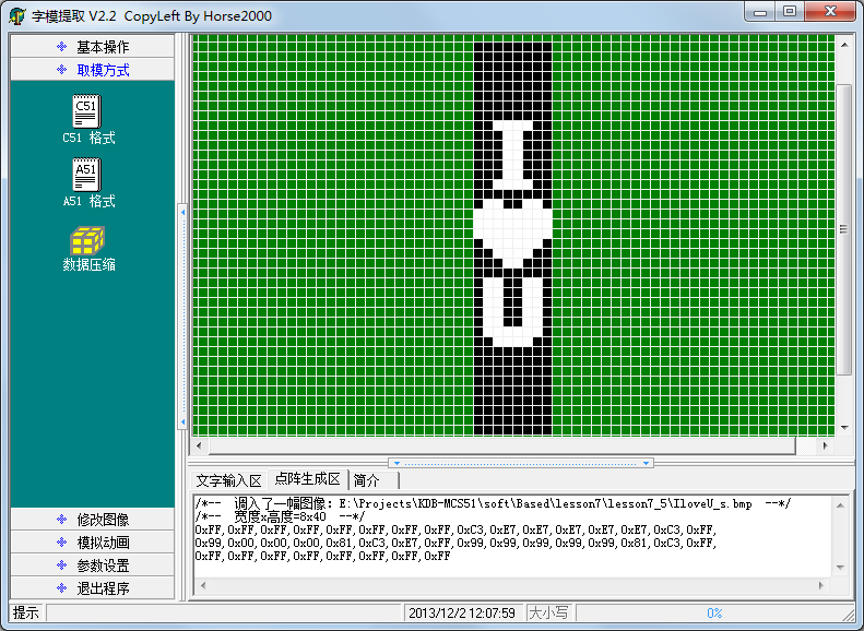 这张图片共有40行,每8行组成一张点阵图片,并且每向上移动一行就出现了一张新图片,一共组成了32张图片。