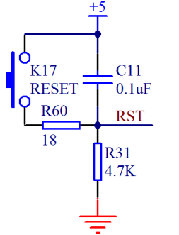 按键复位(即手动复位)有2个过程,按下按键之前,RST 的电压是 0 V,当按下按键后电路导通,同时电容也会在瞬间进行放电,RST 电压值变化为 4700 VCC/(4700+18),会处于高电平复位状态。当松开按键后就和上电复位类似了,先是电容充电,后电流逐渐减小直到 RST 电压变 0 V 的过程。我们按下按键的时间通常都会有几百毫秒,这个时间足够复位了。