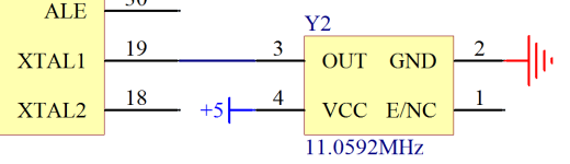 有源晶振通常有4个引脚,VCC,GND,晶振输出引脚和一个没有用到的悬空引脚(有些晶振也把该引脚作为使能引脚)。无源晶振有2个或3个引脚,如果是3个引脚的话,中间引脚接是晶振的外壳,使用时要接到 GND,两侧的引脚就是晶体的2个引出脚了,这两个引脚作用是等同的,就像是电阻的2个引脚一样,没有正负之分。对于无源晶振,用我们的单片机上的两个晶振引脚接上去即可,而有源晶振,只接到单片机的晶振的输入引脚上,输出引脚上不需要接,如图8-3和图8-4所示。