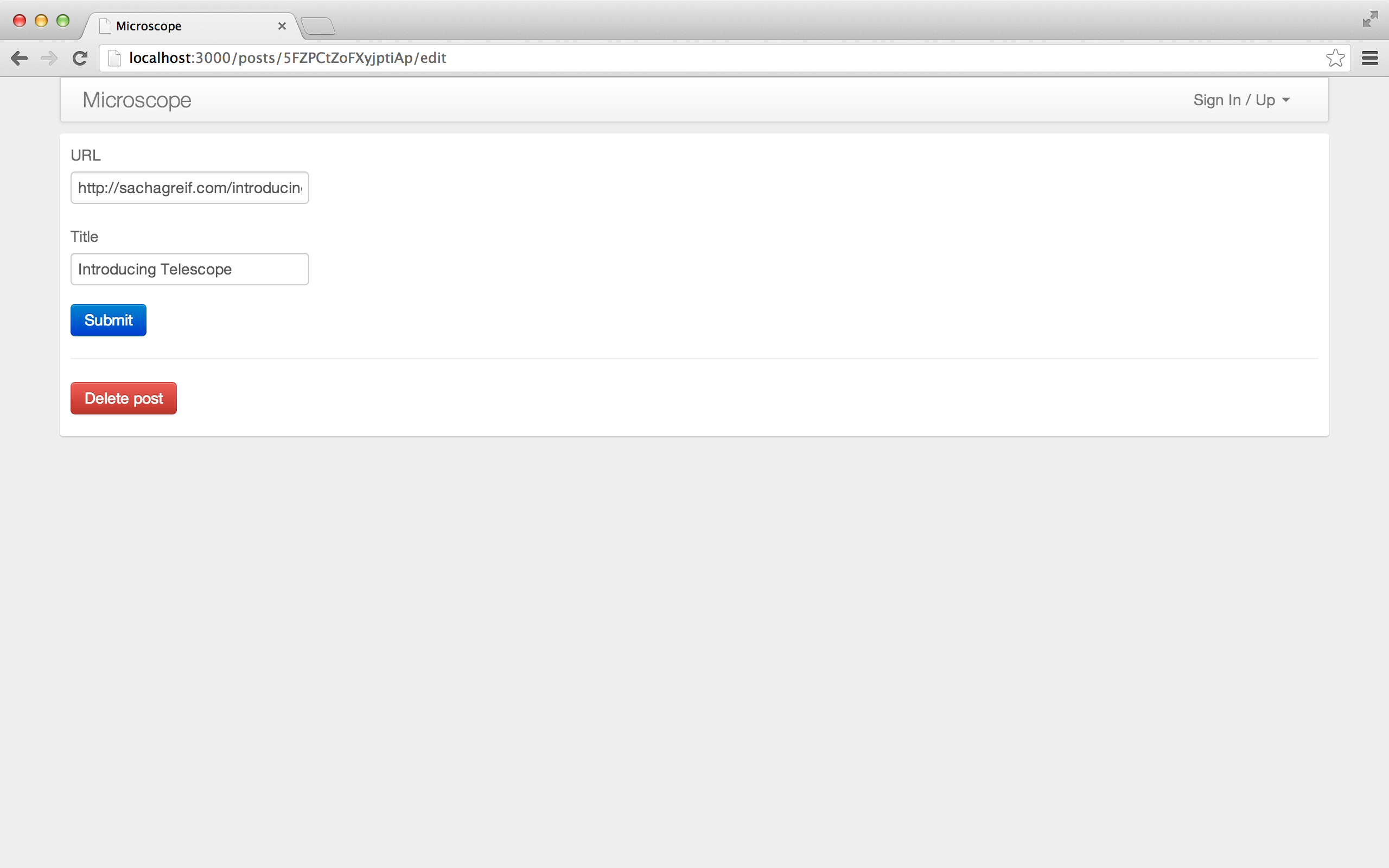 你也许注意到了在我们的代码中没有检查链接是否重复的代码。这就意味着用户成功添加一个链接后,再编辑时就会绕过检查。这个问题同样可以通过为编辑帖子表单使用 Meteor 内置方法来解决,但是我们将它作为练习留给读者。