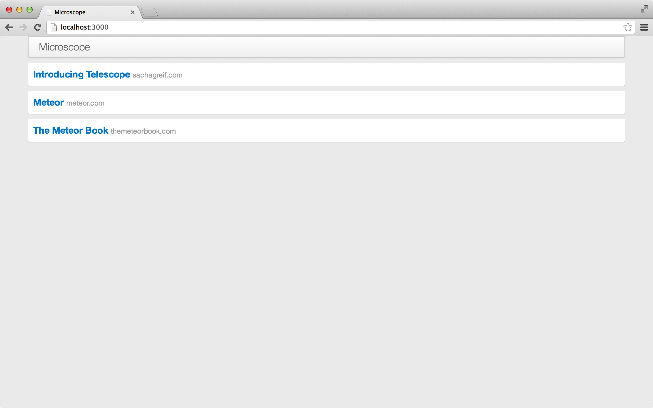如果你正确地紧跟着我们的进度,这时候你就会在浏览器中看到一个 post 列表。但这个列表只是调用了静态数据,它没有利用到 Meteor 实时性的特点。我们将在下一章向你展示该如何去修改!