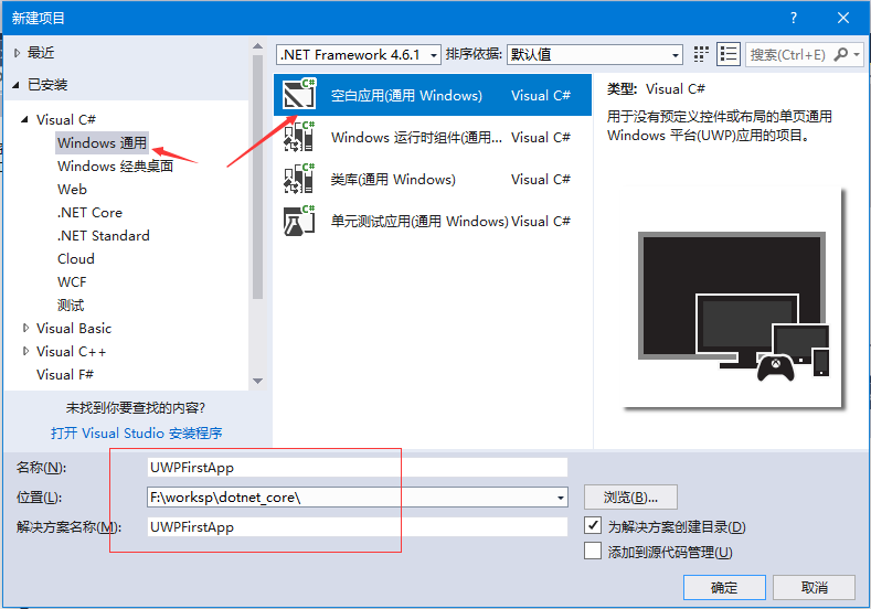 在名称字段中输入UWPFirstApp 命名该项目,并选择存储目录,然后单击【确定】。