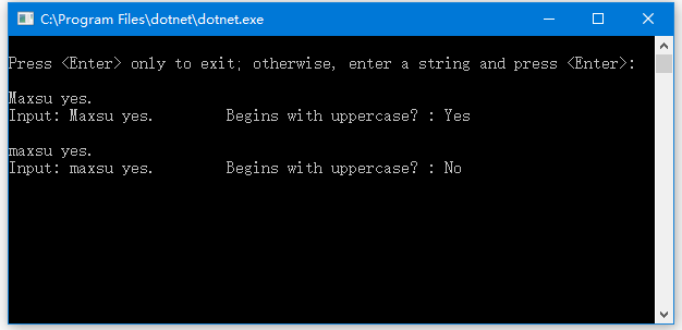 Console.WriteLine("Input: {0} {1,30}: {2}n", input, "Begins with uppercase? ",