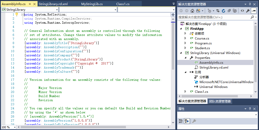 可以看到它已经创建了一个PCF格式的新项目。右键单击解决方案资源管理器中的StringLibrary项目并选择属性。
