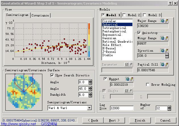 Models部分:model1,model2,model3表示可以用多个通用函数来拟和半变异函数模型。如果数据为各向异性,则需要选中Anisotropy(其实大多数空间数据是各向异性的,各向同性只是相对的),当选中此选项时,黄线变为多条,表示多个方向的拟合函数。