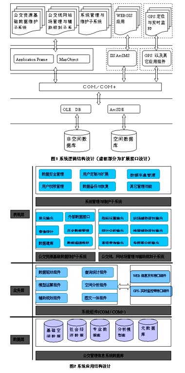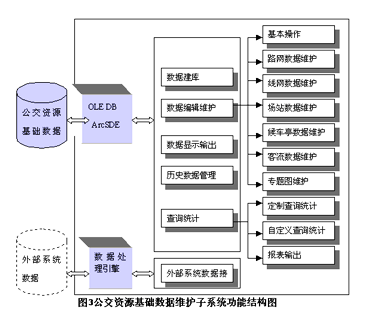 1)数据资源的管理维护:建立基础地理空间数据库和公交资源数据库,为公交运营管理和决策提供必要的信息支持,实现系统数据的动态更新维护机制,并为系统数据库扩展留有接口。