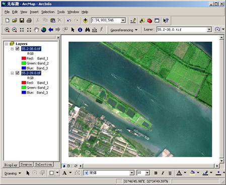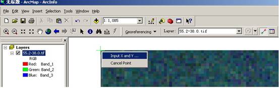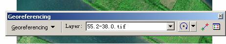 所有图件扫描后都必须经过扫描配准,对扫描后的栅格图进行检查,以确保矢量化工作顺利进行。 l 打开ArcMap,添加“影像配准”工具栏。 l 把需要进行配准的影像—55.2-38.0.tif增加到ArcMap中,会发现“影像配准”工具栏中的工具被激活。