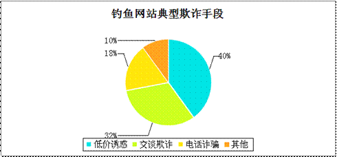 据金山网络安全中心云网址鉴定系统统计数据显示,2010年1-10月,平均每天新增的与网络购物相关的钓鱼网站约为1500个。其中典型的诈骗方式主要分为三大类:低价诱惑、交谈诈骗、电话诈骗。据统计,低价诱惑类网购钓鱼网站约占40%左右,交谈诈骗类钓鱼网站近年来上升明显,约占32%,而400电话诈骗类钓鱼网站约占18%。