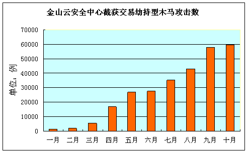 新型交易劫持木马是2010年刚刚兴起的一种网购威胁。通过在正常的网络购物交易过程中给消费者电脑植入木马,将消费者的网上付款流程直接引向假网银网站或者假的第三方支付网站。在消费者以为完成了正常的购物流程后,才发现卖方没有收到货款。这种方式很隐蔽,也让消费者防不胜防。据金山网络安全中心以及客户服务中心最新统计数据显示,2010年交易挟持类木马已经从最初的1个,发展为近千个不同种类的木马,每天金山云查杀系统截获的交易劫持型木马攻击用户电脑在2000例左右。