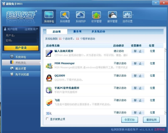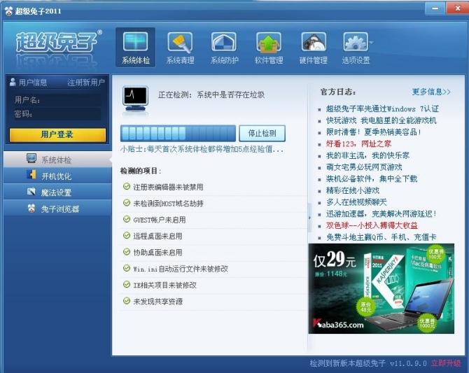 开机后,超级兔子2011会自动扫描注册表、系统关键文件夹、系统漏洞等,对系统的安全性进行全面深入的检查,并自动把结果显示出来。根据软件的提示,普通用户可以很方便的清除系统垃圾、弥补系统漏洞。作为国内率先通过Windows 7认证的工具软件,超级兔子与微软有着长期而深入的合作,对于系统垃圾文件的辨别、系统漏洞的信息获取有着先天优势。