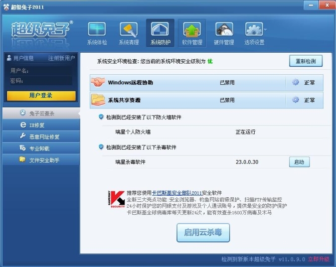 兔子还和卡巴斯基合作,为大家提供了卡巴斯基安全部队免费一年的激活码。由于现在卡巴斯基强大的杀毒功能早已在业界口碑甚好,配合超级兔子的系统保护功能,从电脑硬件到网络安全全方位立体化的为用户考虑,绝对会给我们用户一个自由的网络空间。
