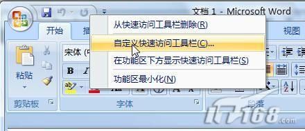 我们使用“自动图文集”最多的地方还是在Word中,下面来演示在Word 2007中调用的方式。进入Word 2007,鼠标选择窗口左上方的“快速访问工具栏”,鼠标右键调用菜单,选择“自定义快速访问工具栏”,如图1。