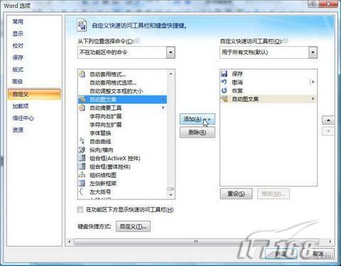 接下来系统显示的命令非常多了,你要做的就是向下拖动列表,直至找到“自动图文集”命令,选中后,点击“添加”按钮增加新工具栏按钮,点击“确定”完成操作,如图3。