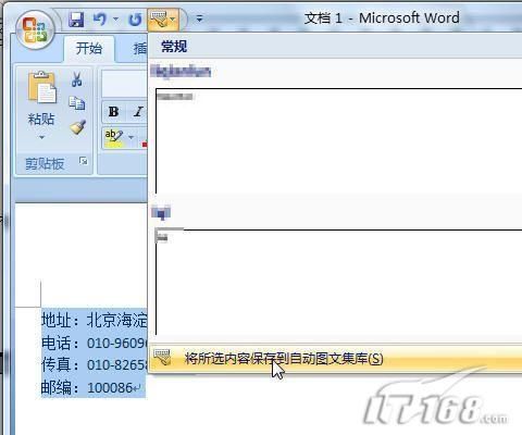 先键入所需词条,然后用鼠标选定文字内容,点击“快速访问工具栏”上的“自动图文集”按钮,在菜单中选择“将所选内容保存到自动图文集库”,如图4。