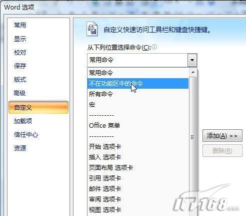 进入“Word选项”对话框,点击“从下列位置选择命令”,在下拉列表中选择“不在功能区中的命令”,如图2。