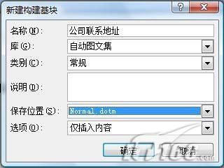 接下来,Word自动转入“新建构建基块”对话框,设置名称为所需,例如“公司联系地址”,选择类别、保存位置“Normal.dotm”(通用模版),点击“确定”完成,如图5。