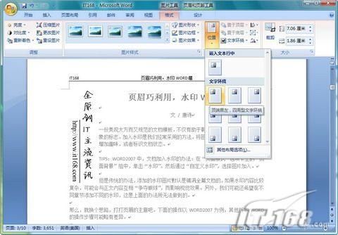 点击插入的水印图片,则会自动激活“格式”选项卡。在“排列”组中单击“位置”,然后在弹出的下拉项中选择合适的文字环绕方式。可以看到,刚才倔脾气的图片已经乖乖地跑了下来。(图4)