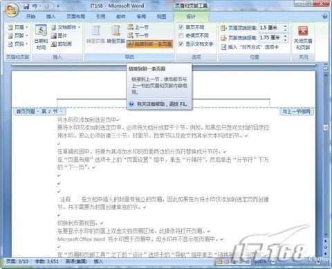 然后在文档上面页眉区域单击右键,选择“编辑页眉”,则自动激活了“设计”选项卡。在“导航”组中,我们可以单击“上一节”或者“下一节”在各个节段之间跳跃。在需要分开定义页眉的两节之间,单击“导航组”中的“链接到前一条页眉”,使其不再选中。(图2)