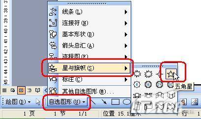 2、单击“绘图工具栏”中的“自选图形”→星与旗帜→五角星,这时会出现一个“在此处创建图形”的方框提示,把鼠标指针指向方框的外边(这样就不受方框的限制,以免给接下来的操作带来麻烦。),按住键盘上的一个Shift键(画正五角星),再按住鼠标左键拖动画出一个五角星,如图2。