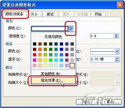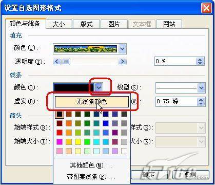 4、在“设置自选图形格式”对话框中的“颜色与线条”选项卡下,再单击“线条”项中的“颜色”后边的下拉按钮,选择“无线条颜色”,最后点“确定”退出,如图5。