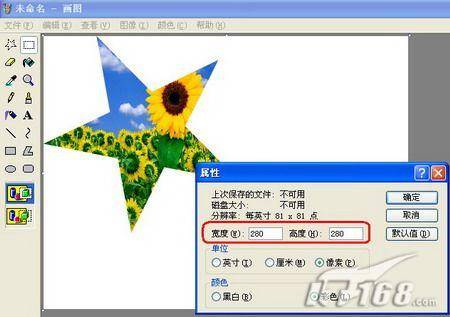 7、在画图窗口中单击“图像”→属性,在“属性”对话框中根据五角星的大小把宽度和高度都改为280,最后点“确定”退出。由于在画图窗口中粘入的五角星右边和下边有很大一块白边,所以在这里把宽度和高度缩小一下,如图7。