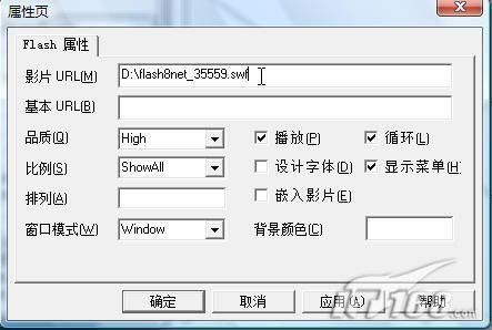 在“属性页”对话框中,你需要在“影片URL”中键入Flash动画的完整本地路径,如果需要Flash动画自动播放,还要勾选“播放”选项,如图7。