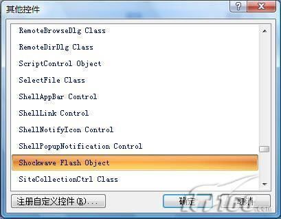 进入“其他控件”对话框,在控件列表中选择“Shockwave Flash Object”对象(控件列表内容很多,用户可以按键盘“s”键,快速定位控件),单击“确定”按钮完成,如图4。