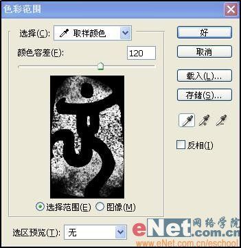 8、执行菜单栏中的“选择”“色彩范围”命令,在打开的色彩范围对话框中设置容差为120,如图06所示,用吸管单击所需部分,效果如图07所示。