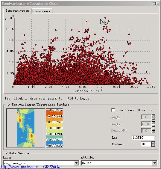 如果任意两点的值都要计算,当采样点很多时,数据量便很大,因而根据距离和方向对样点距离进行了分组。下列参数便是为此要求而设置:Lag,步长值;Number of,步长组数。步长值和步长组数之乘积应小于采样点区域的坐标范围的一半。如下图。