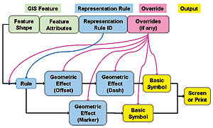 制图的人经常要面对的一个困难是如何处理制图自动化(统一的制图可视化规则)与制图自主性(地图表现的自主性)之间的冲突。ArcGIS 9.2中新的制图表现和覆盖功能使得自动化和自主性统一起来,解决了许多这类的问题。仅有少量信息被追加到空间数据库的地理要素类上,用来存储统一的表现规则和单个要素的图形覆盖信息。